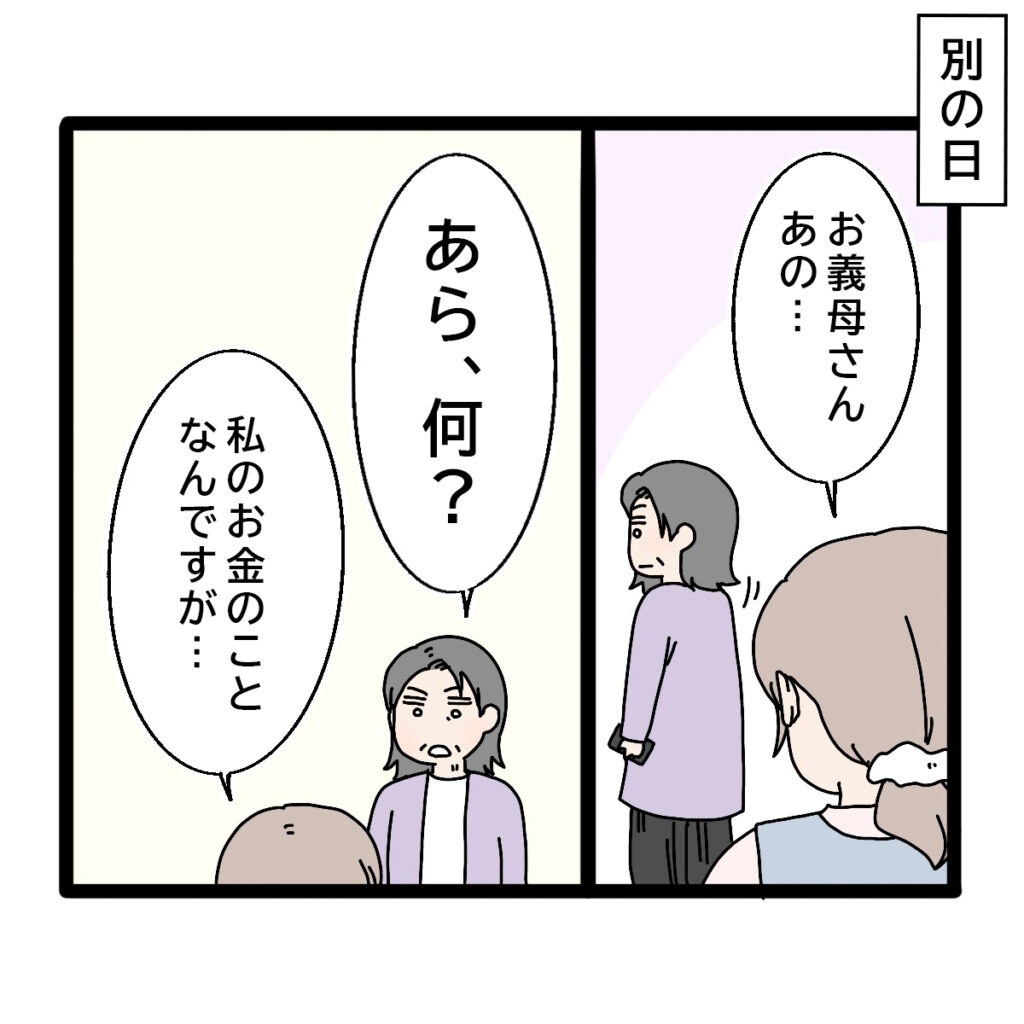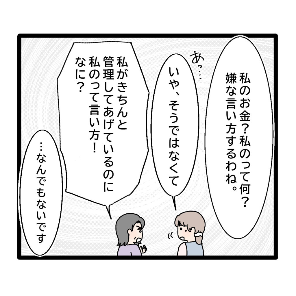 「私のお金?私のって何?嫌な言い方するわね」と義母に冷たい口調でそう言われ、「あっ・・いや、そうではなくて」と言いかけると、「私がきちんと管理してあげているのに私のって言い方!なに?」と常にケンカ腰の義母。結局、「・・なんでもないです」と引き下がるしかありませんでした。