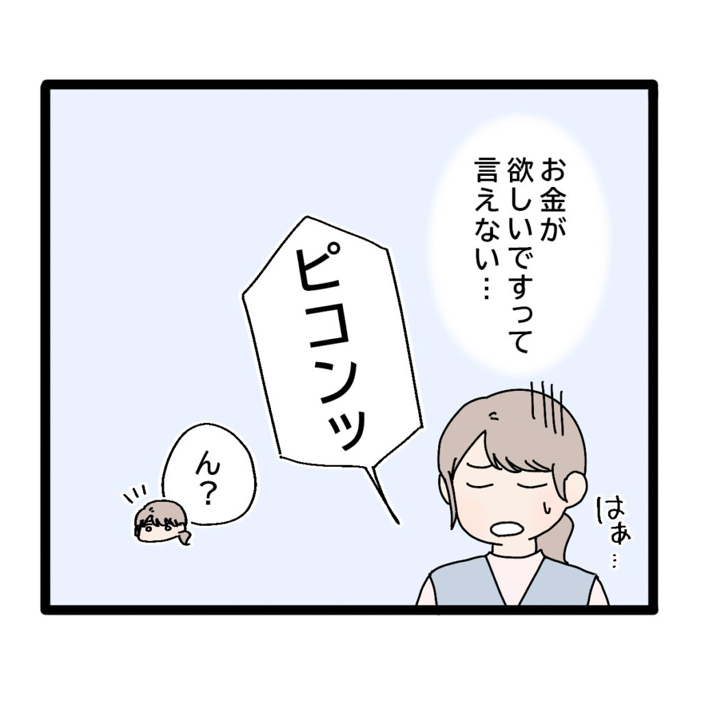 「はぁ・・お金が欲しいですって言えない・・」とため息をついていると、ピコンッ!とスマホが鳴り、見てみると、「ん?」