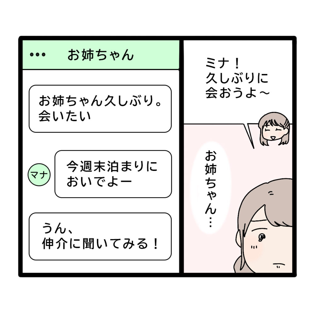 「ミナ!久しぶりに会おうよ~」とお姉ちゃんからのメッセージが!すぐに「お姉ちゃん久しぶり。会いたい」と返信すると、「今週泊まりにおいでよー」とメッセージが!「うん、伸介に聞いてみる!」とメッセージを送りました。