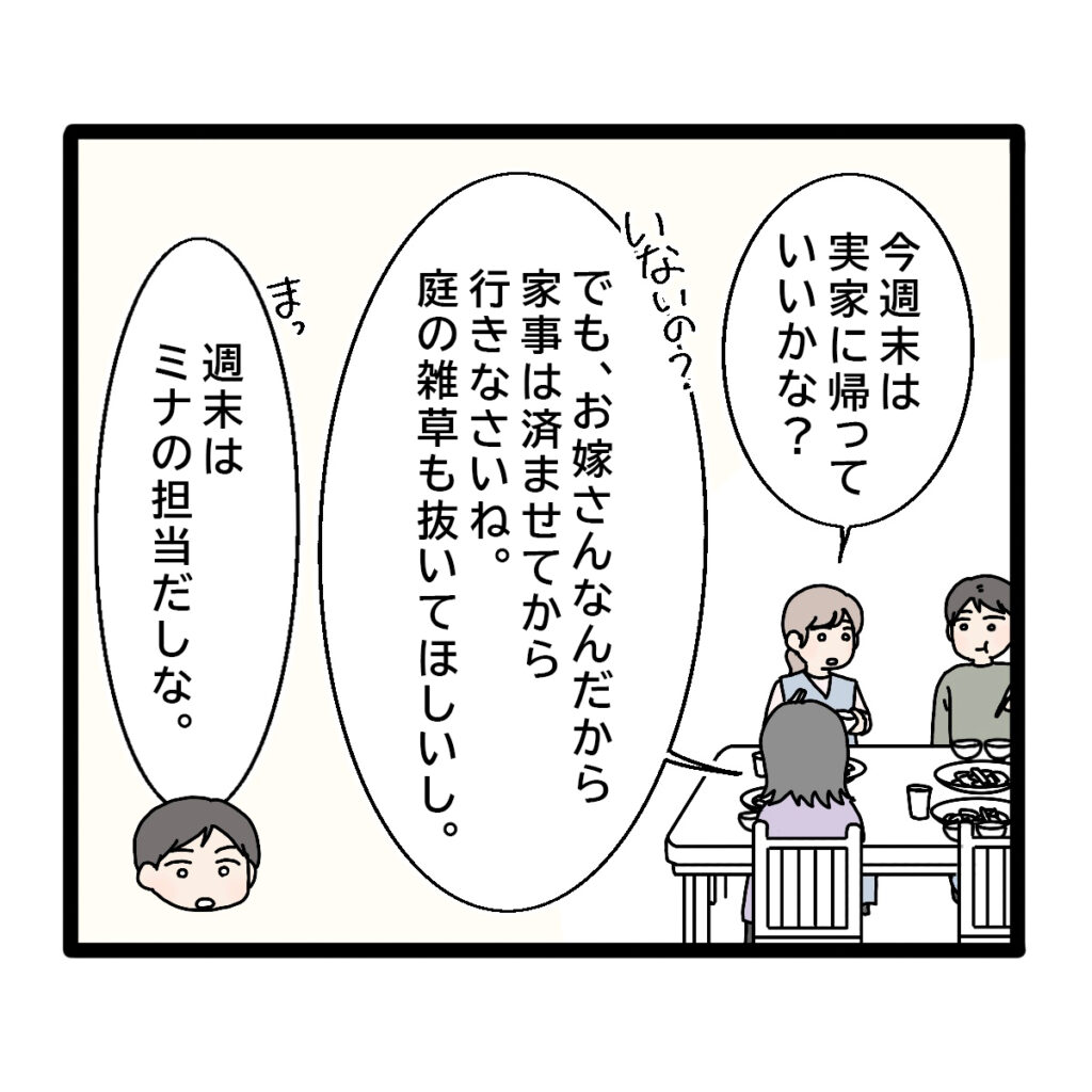 その夜、食事の時に、「今週末は実家に帰っていいかな?」と伸介に言うと、「いないの?でも、お嫁さんなんだから、家事は済ませてから行きなさいね。庭の雑草も抜いてほしいし」と言い出す義母。すると、「まっ、週末はミナの担当だしな」と伸介も義母に従うのでした。