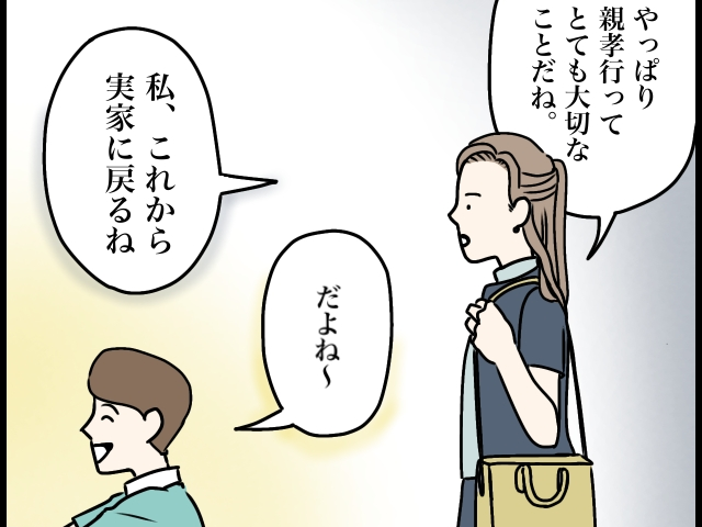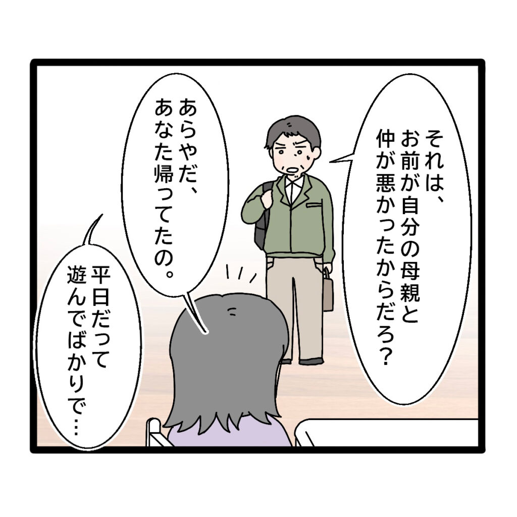 すると、「それは、お前が自分の母親と中がわるかったからだろ?」と義父が言い、「あらやだ、あなた帰ってたの」とたずねるも、「平日だって遊んでばかりで・・」と答えました。