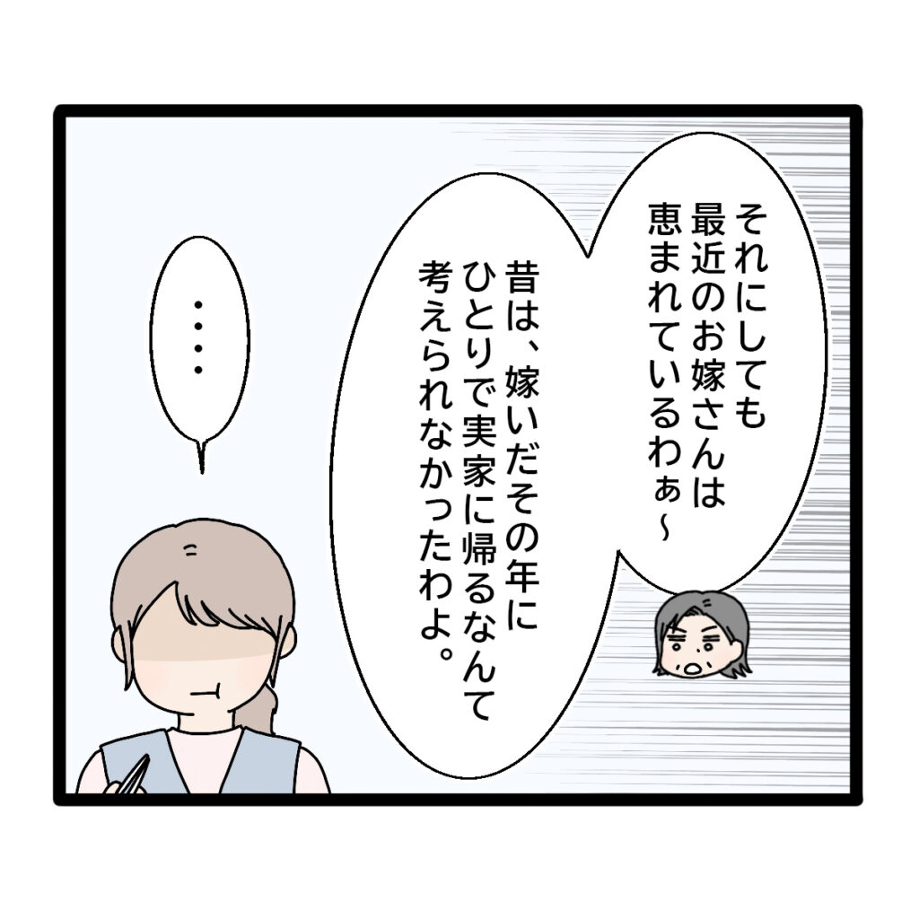 「それにしても、最近のお嫁さんは恵まれているわぁ~。昔は嫁いだその年に一人で実家に帰るなんて考えられなかったわよ」平然とそう言う義母に言葉を失い無言になる私。