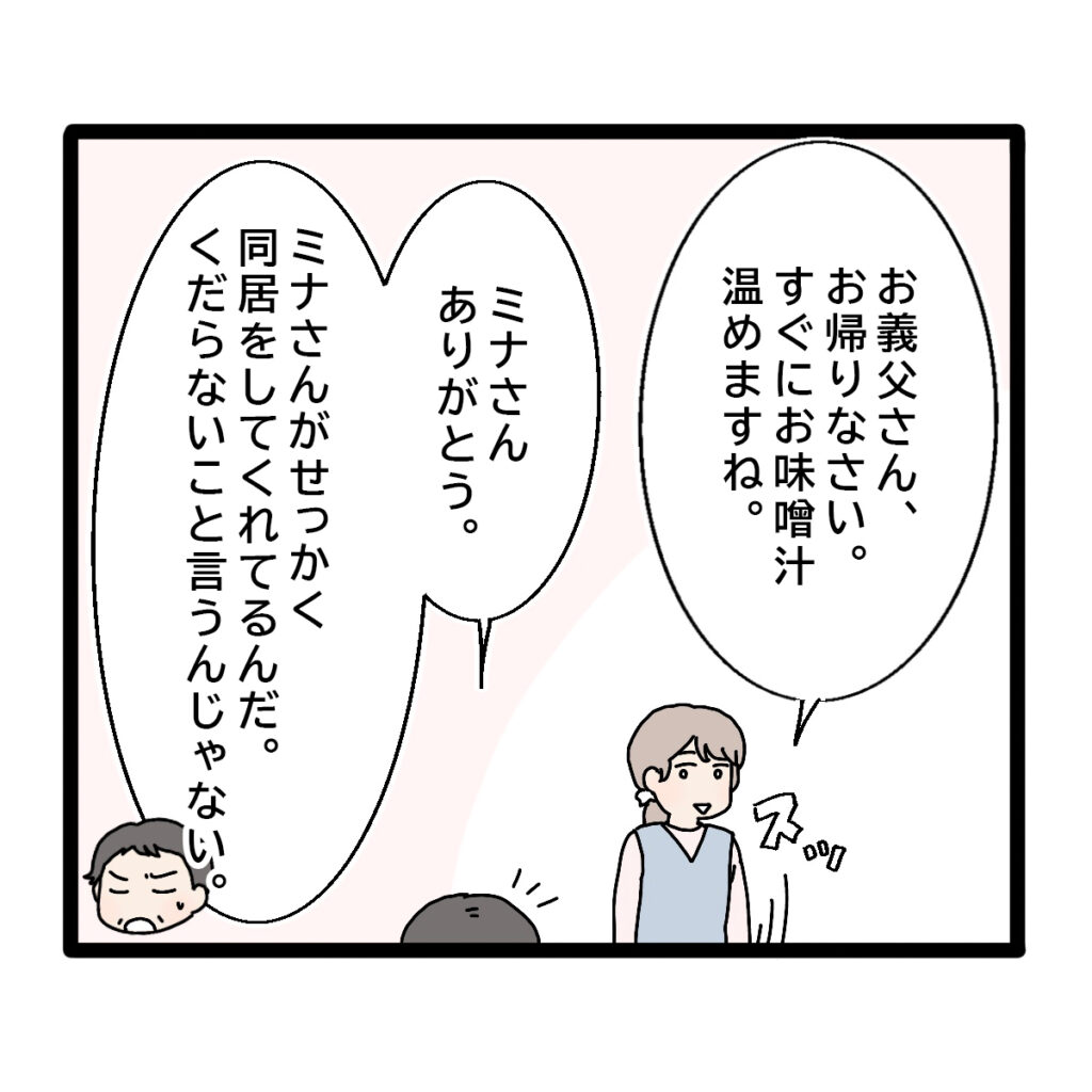 義父の帰宅に気づいた私は、「お義父さん、お帰りなさい。すぐにお味噌汁温めますね」そう言って立ち上がると、「ミナさんありがとう。ミナさんがせっかく同居してくれてるんだ。くだらないことを言うんじゃない」と義母をたしなめました。