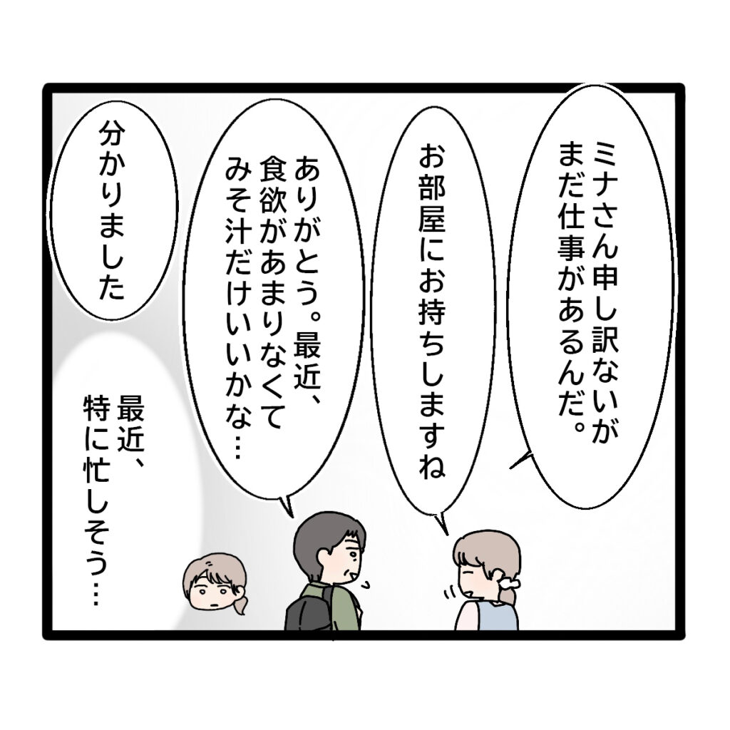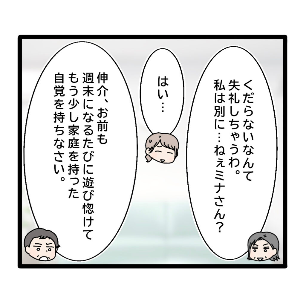 週末実家に帰ると話した途端、ミナさんを否定する義母。すると帰って来た義父が聞きつけ義母を注意。伸介さんにも注意した後、食欲がなく、部屋で味噌汁だけ飲むと話す義父を、「最近、特に忙しそう・・」と心の中で呟くミナさん、義母にしっかり注意してくれた義父の体調が心配ですが、義父の言葉がちゃんと響いていることを願うばかりです。