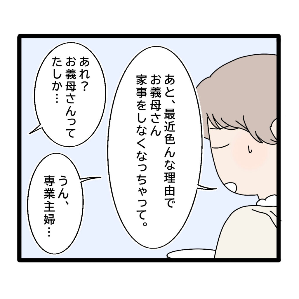 そして、「あと、最近色んな理由でお義母さん家事をしなくなっちゃって」と話すと、「あれ?お義母さんってたしか・・」と姉に言われ、「うん、専業主婦・・」と答え、