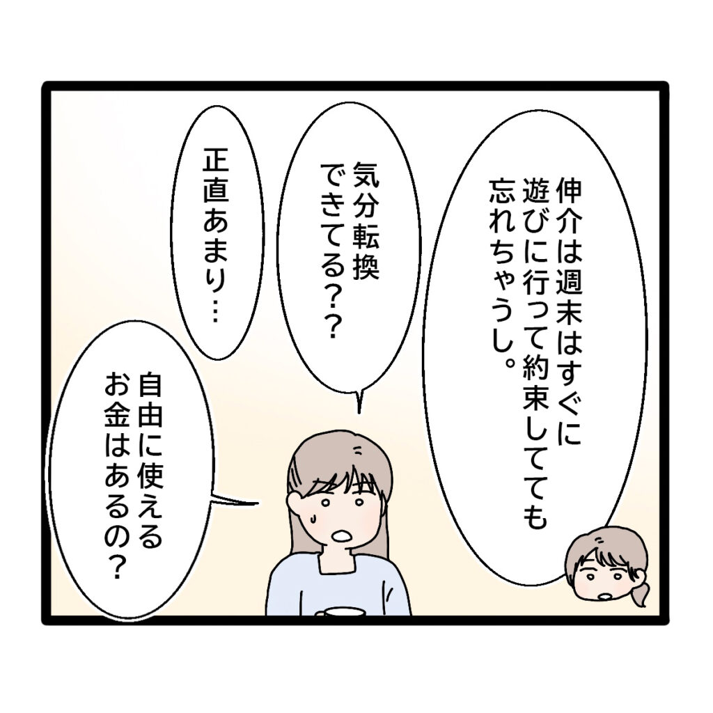 「伸介は週末すぐに遊びに行って、約束してても忘れちゃうし」と言うと、「気分転換できてる?」と心配そうに姉が言い、「正直あまり・・」と答えると、「自由に使えるお金はあるの?」と聞かれました。