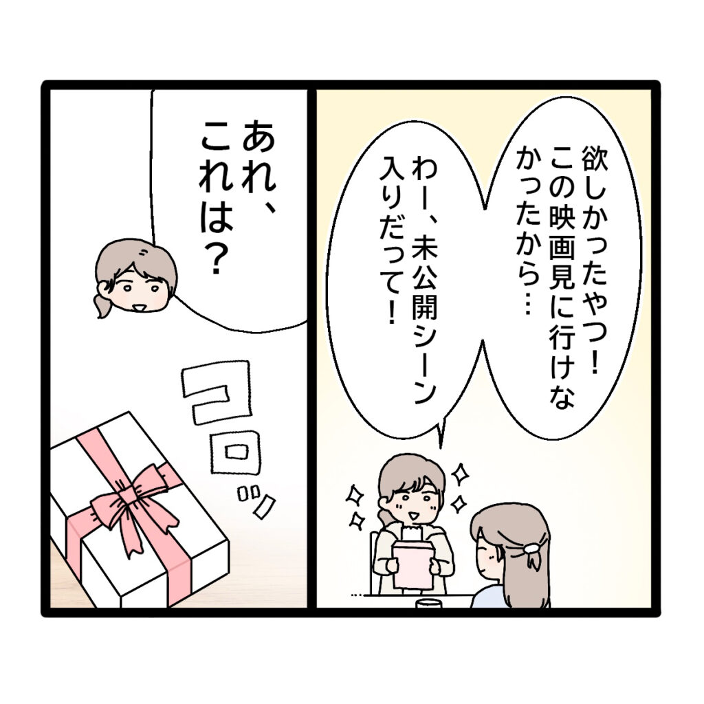 「これ欲しかったやつ!この映画見に行けなかったから・・。わー!未公開シーン入りだって!」ウキウキしながらそう言うと、もう一つ小さな箱が・・「あれ、これは?」なんだろうと思って姉にたずねました。