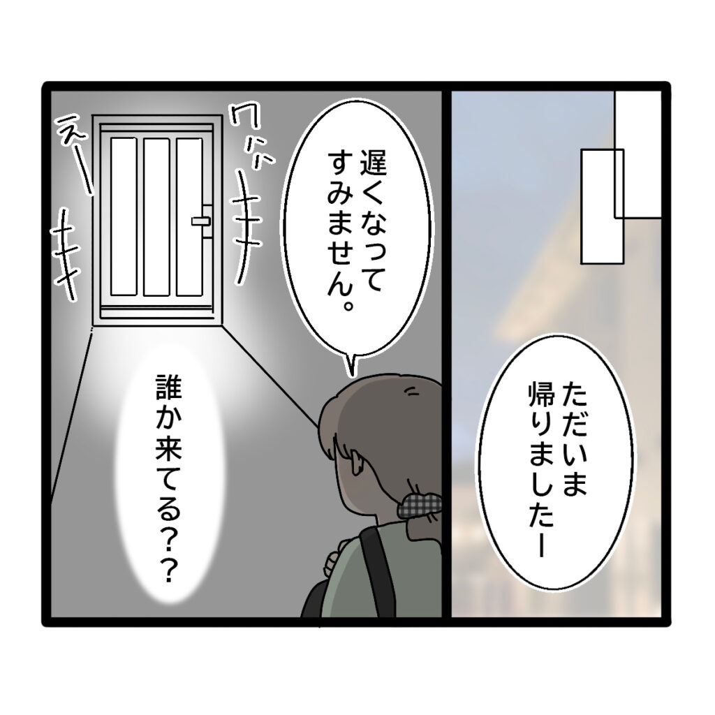 そして、義実家に帰ってきた私。「ただいま帰りましたー。遅くなってすみません」そう言って玄関のドアを開けると、リビングから賑やかな声が。「誰か来てる??」