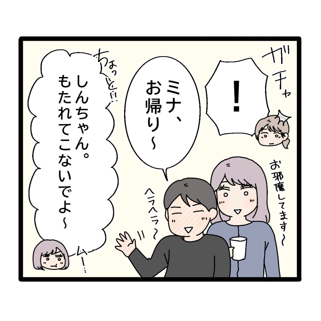 そう思いながらリビングのドアを開けると、「!」なんとそこにはユウカさんが!「お邪魔してます~」そう言いながら伸介の隣に!「ミナ、お帰り~」とヘラヘラしながら答える伸介に、「ちょっと!しんちゃん。もたれてこないでよ~」そう言いながらムッとするユウカさん。