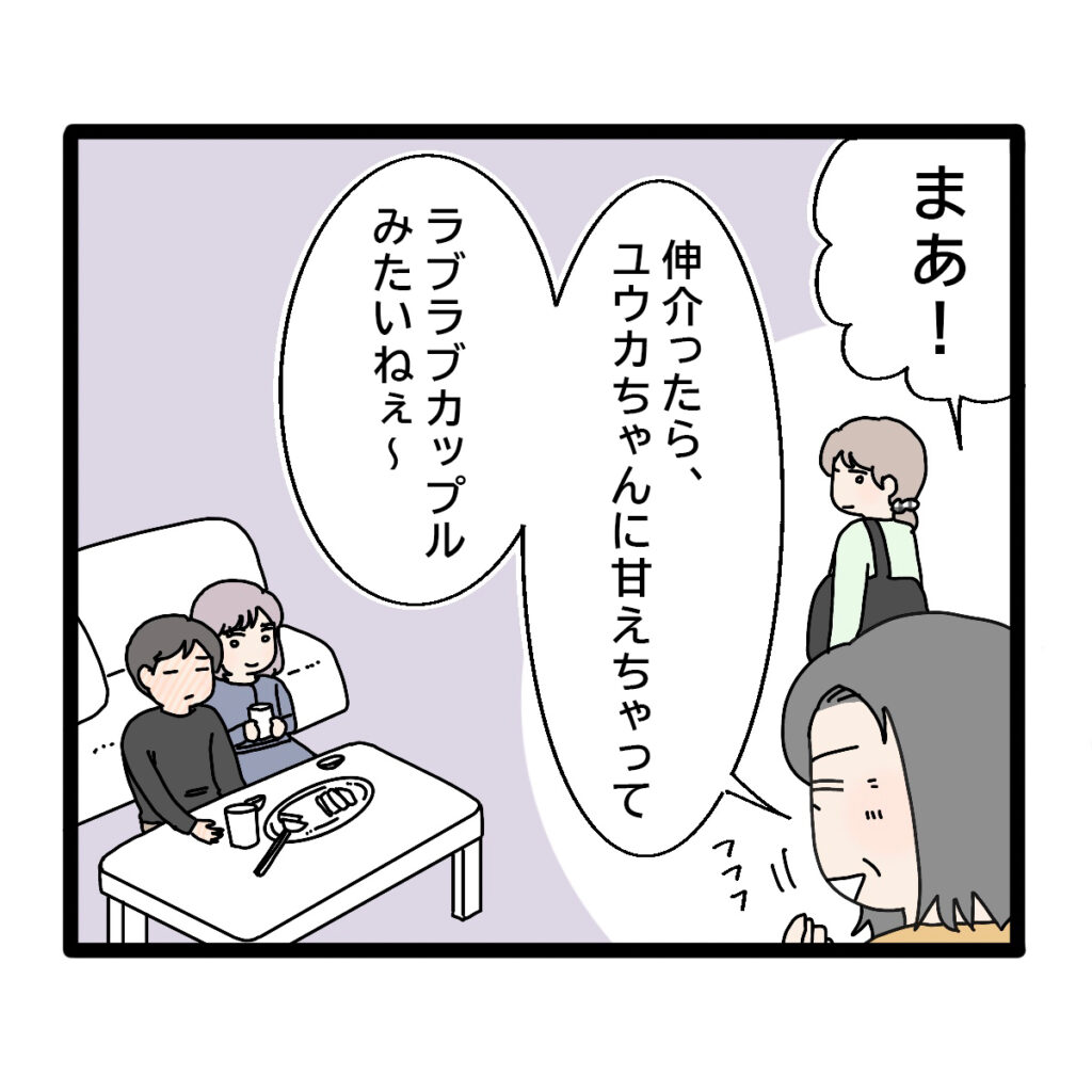 すると、「まあ!伸介ったら、ユウカちゃんに甘えちゃって。ラブラブカップルみたいねぇ~」と二人をはやし立てるように言う義母。