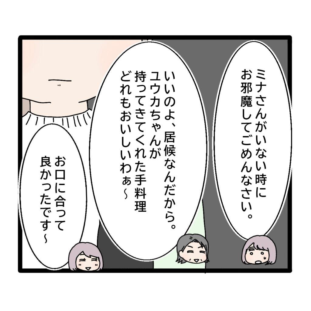 すると、「ミナさんがいない時にお邪魔してごめんなさい」と謝るユウカさんに、「いいのよ、居候なんだから。ユウカちゃんが持ってきてくれた手料理どれもおいしいわぁ~」と私を居候扱いしてユウカさんを絶賛。「お口に合って良かったです~」とユウカさんも嬉しそう。