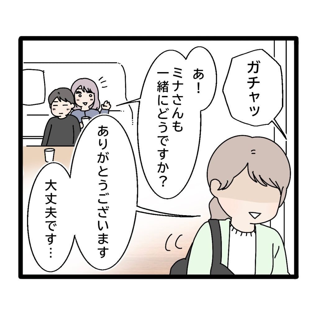 この場にいる自分がいたたまれなくて部屋から出ようとすると、「あ!ミナさんも一緒にどうですか?」とユウカさん。「ありがとうございます。大丈夫です・・」そう言ってリビングを後にしたのでした。