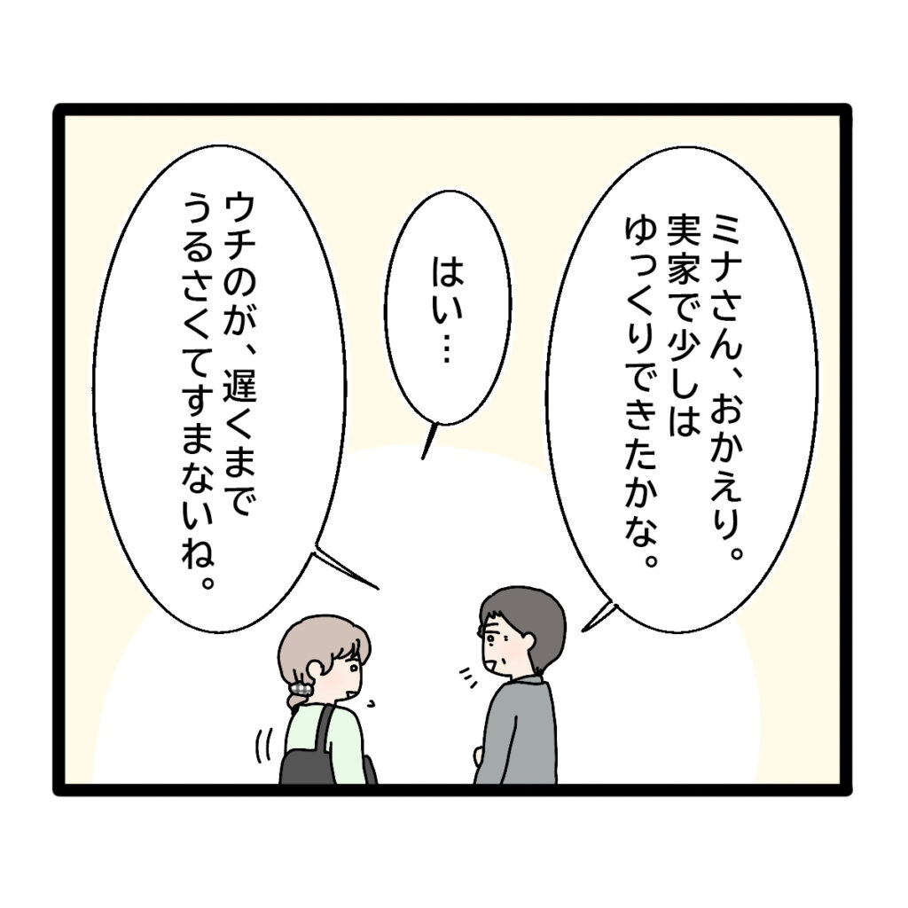 すると、「ミナさん、おかえり。実家で少しはゆっくりできたかな」義父にそう言われて、「はい・・」と返事をすると、「ウチのが、遅くまでうるさくてすまないね」と謝りました。