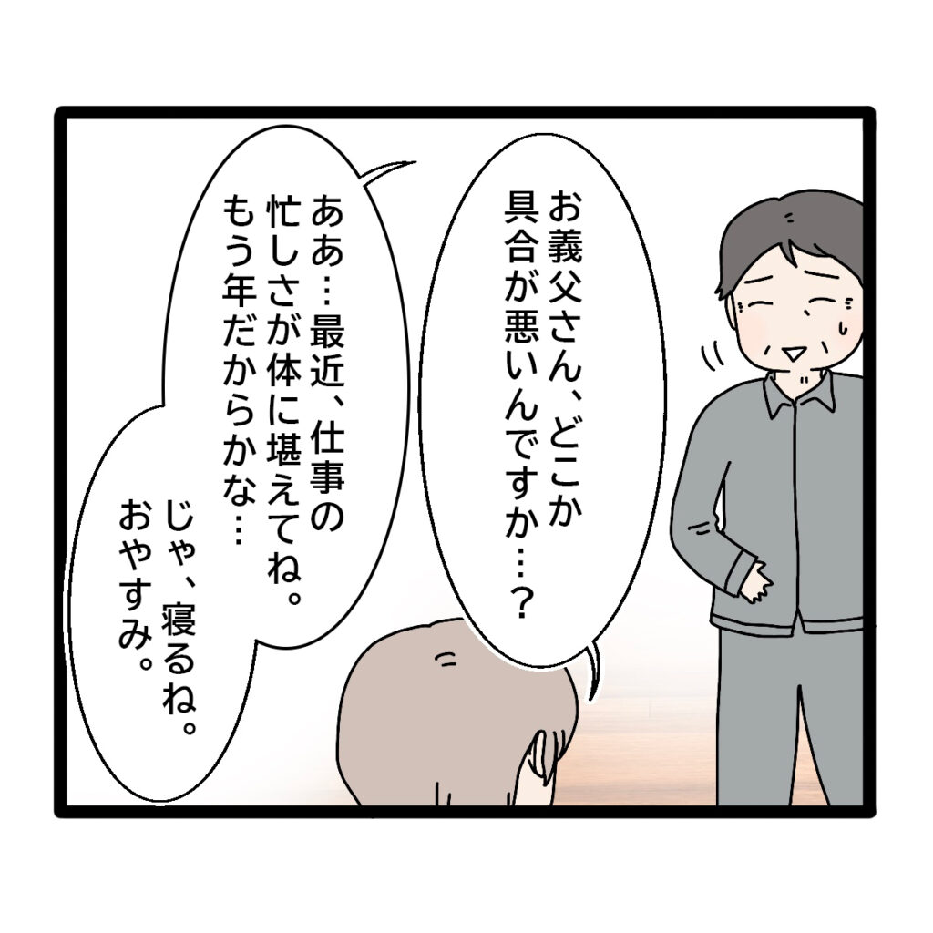 義父を見て、「お義父さん、どこか具合が悪いんですか・・」驚いてそうたずねる私に、「ああ・・最近、仕事の忙しさが体に堪えてね。もう年だからかな・・じゃ、寝るね。おやすみ」そう言って寝室へ行ってしまいました。