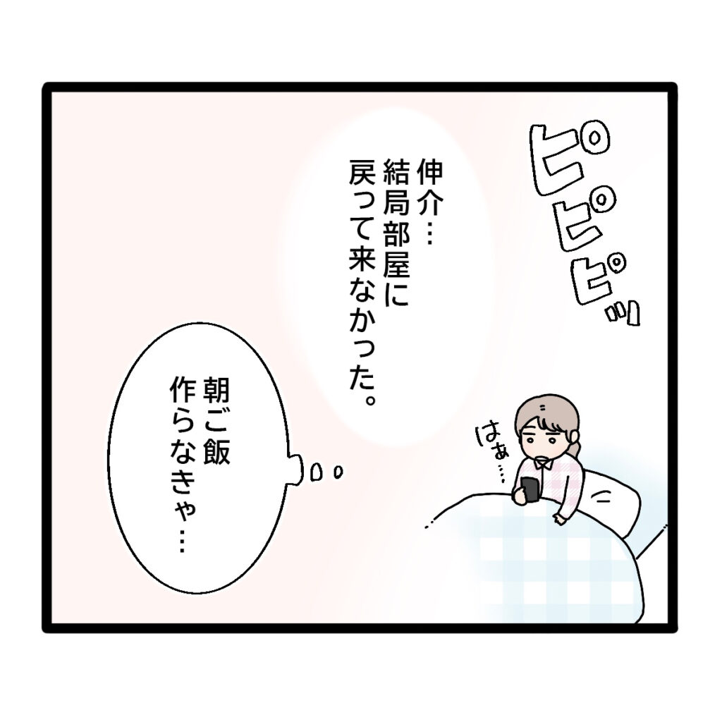 朝、目覚まし時計が鳴って起き上がると伸介がいない。伸介は結局部屋に戻って来ませんでした。