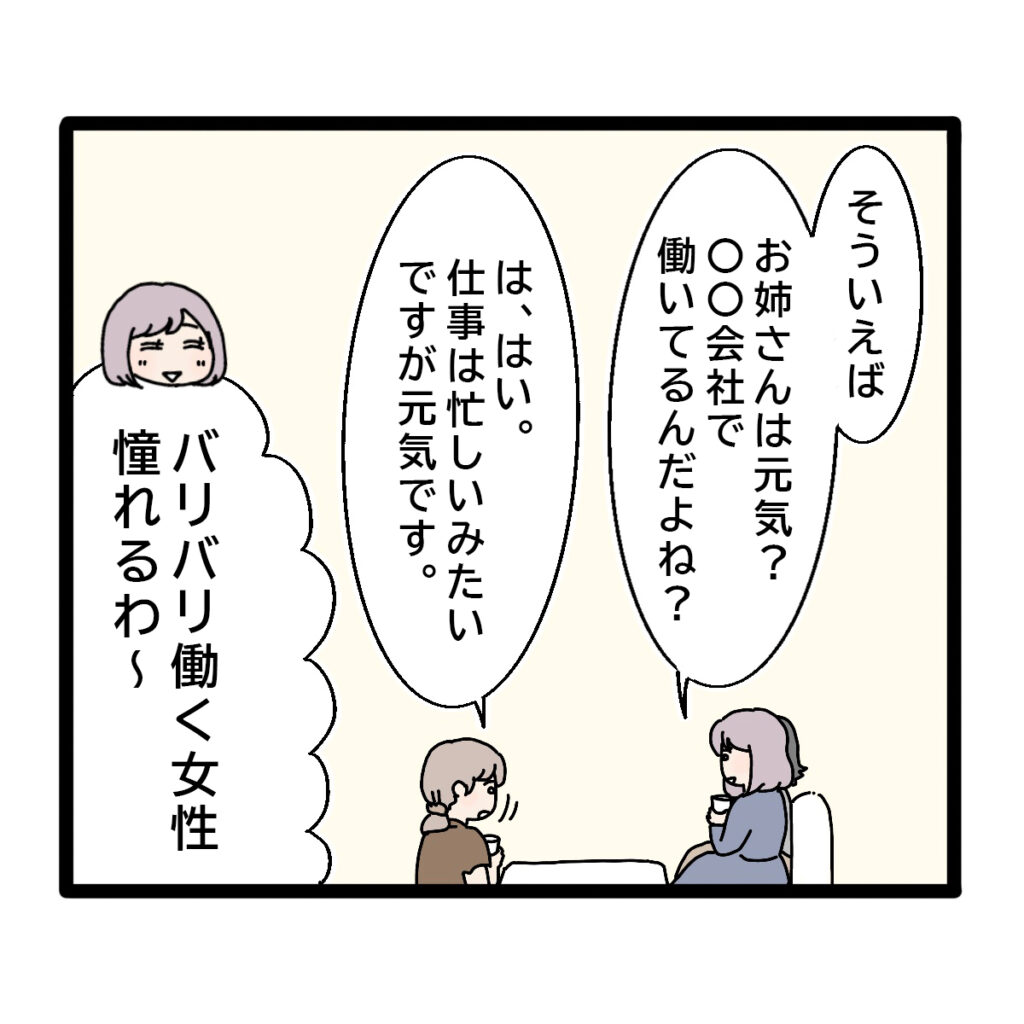すると、「そういえば、お姉さんは元気?〇〇会社で働いてるんだよね?」ユウカさんにそう聞かれ、「は、はい。仕事は忙しいみたいですが元気です」と答えると、「バリバリ働く女性憧れるわ~」とユウカさん。