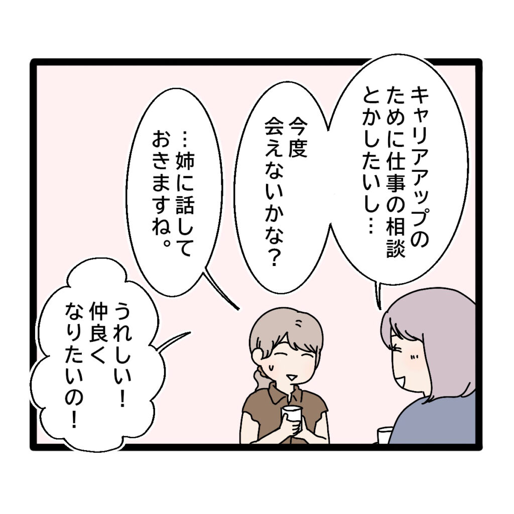 「キャリアアップのために仕事の相談とかしたいし・・今度会えないかな?」ユウカさんにそう言われ、「・・姉に話しておきますね」と答えると、「うれしい!仲良くなりたいの!」と嬉しそう。