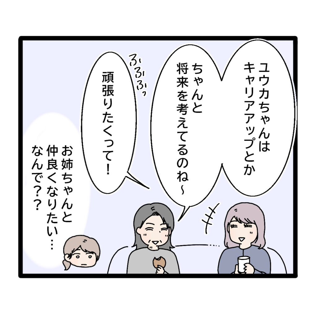 すると義母が、「ユウカちゃんは、キャリアアップとかちゃんと将来を考えてるのね~」と言い、「ふふふっ頑張りたくって!」とユウカさん。「お姉ちゃんと仲良くなりたい・・なんで??」と突然そんなことを言うユウカさんが不思議でなりませんでした。