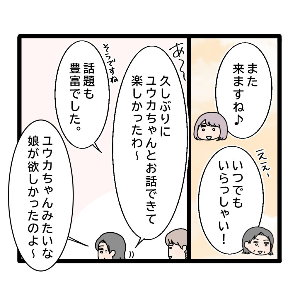 そして、「また来ますね」そう言って帰ろうとするユウカさんを、「ええ、いつでもいらっしゃい!」と見送る義母は、「あ~、久しぶりにユウカちゃんとお話しできて楽しかったわ~」と言い、「そうですね。話題も豊富でした」と答えると、「ユウカちゃんみたいな娘が欲しかったのよ~」と義母。
