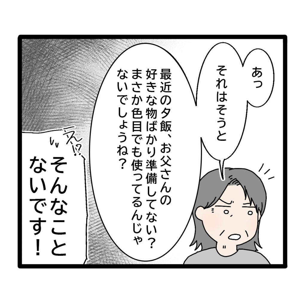 すると、「あっ、それはそうと、最近の夕飯、お父さんの好きな物ばかり準備してない?まさか色目でも使ってるんじゃないでしょうね?」不機嫌そうに言い出して、「え!?そんなことないです!」と慌てて否定したのでした。