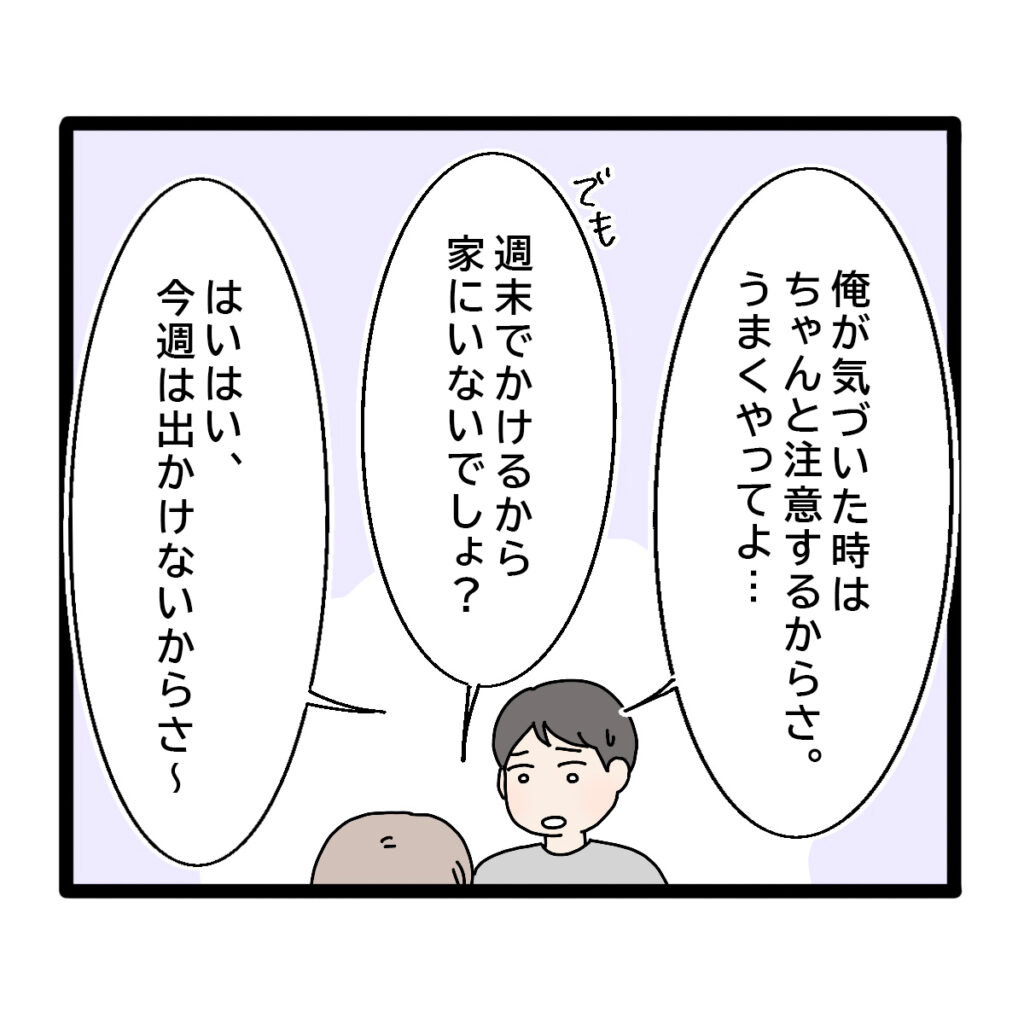 そして、「俺が気づいた時はちゃんと注意するからさ。うまくやってよ・・」伸介がなだめるように言い、「でも、週末出かけるから家にいないでしょ?」と聞き返すと、「はいはい、今週は出かけないからさ~」と伸介が言いました。