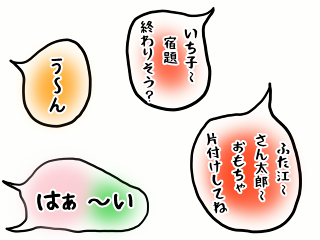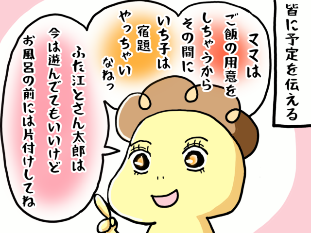 ふた江とさん太郎は今は遊んでてもいいけどお風呂の前には片付けしてね」