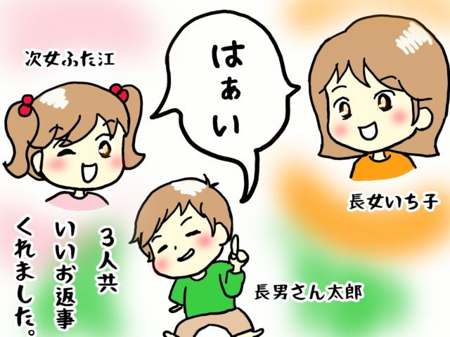 いいお返事をくれる長女いち子、次女ふた江、長男さん太郎。