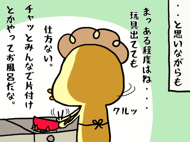 (まっ、ある程度はね・・オモチャ出てても仕方ない。チャットみんなで片付けしてお風呂だな)