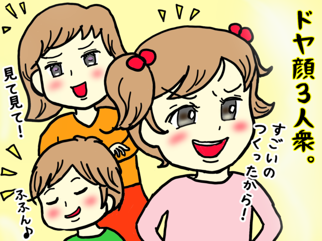 【12】出たーっ!!ドヤ顔3人衆!!達成感の頂点に立つ子ども達。孫のお世話でよみがえる4人育児の思い出|てる子の育児日記