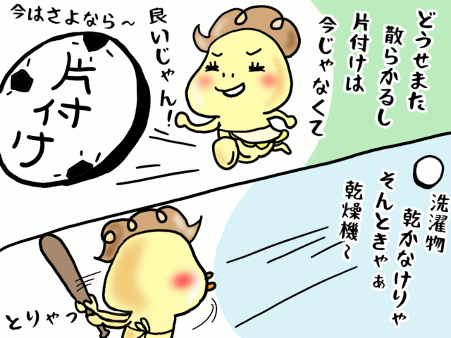 どうせまた散らかるし、片付けは今じゃなくて良いじゃん!今はさよなら~