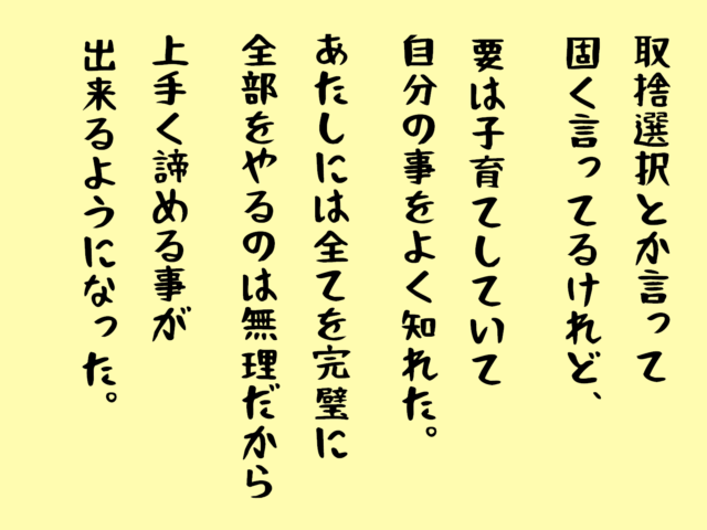 取捨選択とか言って固く言ってるけれど、要は子育てしていて自分の事をよく知れた。