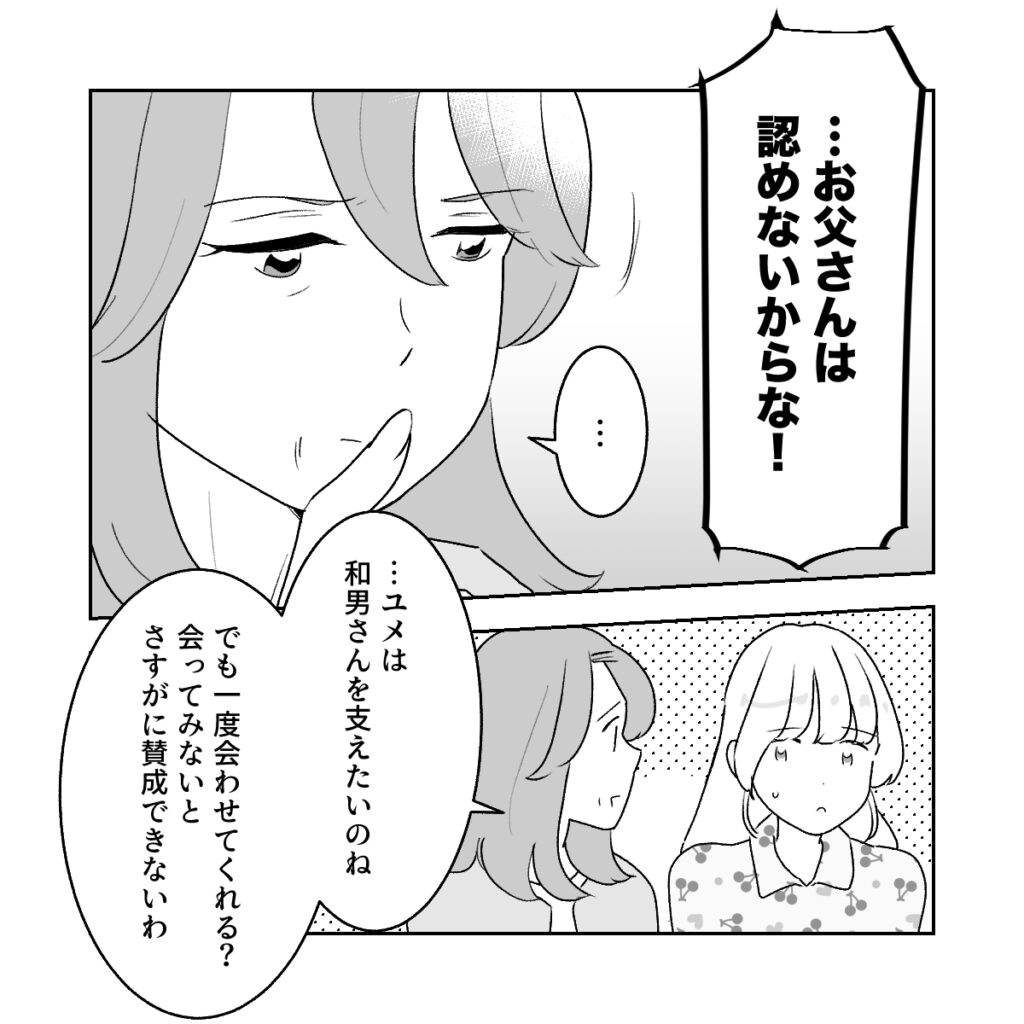 友人のアキさんに続き、お父さんもお母さんも、ユメさんの結婚には反対。冷静に考えれば、自分と同じくらいの年齢の男性が義理の息子になるなんて、そう簡単には受け入れられませんよね。