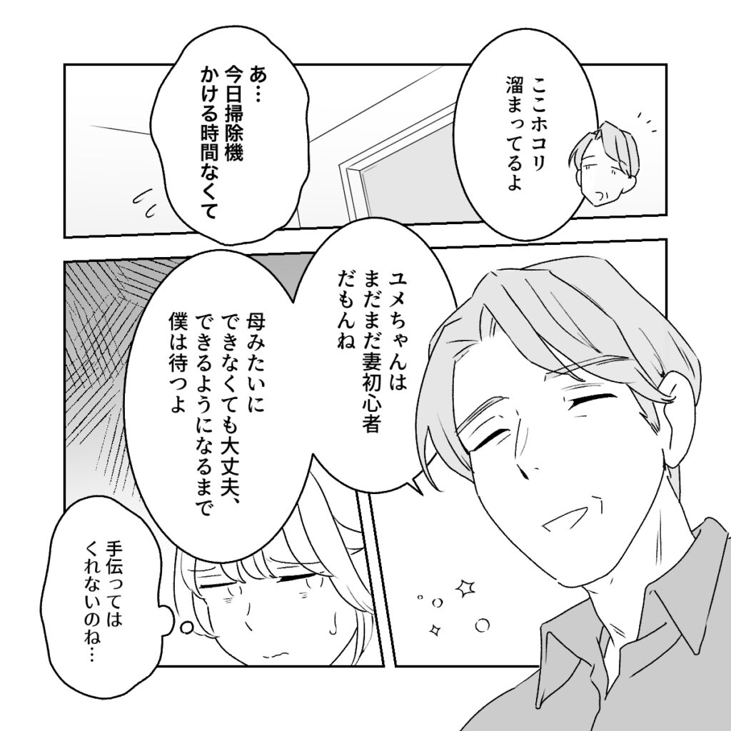 さらに、「ここホコリ溜まってるよ」と指摘され、「あ・・今日掃除機かける時間なくて」と答えると、「ユメちゃんはまだまだ妻初心者だもんね。母みたいにできなくても大丈夫、できるようになるまで僕は待つよ」和男さんが笑顔でそう言うも、「手伝ってはくれないのね・・」とやっぱり不満が残ります。