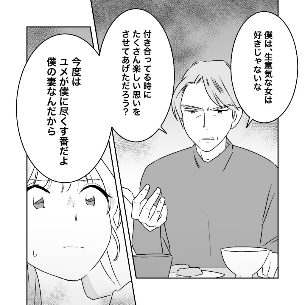 マッチングアプリで彼氏ができた友人アキさんから勧められアプリに登録したユメさんは、落ち着いた雰囲気の男性、28歳年上の和男さんを運命の人だと思うように。デートを重ねた2ヶ月後に、素敵なレストランでプロポーズされ、ユメさんは映画のヒロイン気分。両親やアキさんにも心配された上に猛反対されますが、絶対に幸せになれると自信満々。母親に一方的に同棲を報告し、婚姻届を押し付けるように預かってもらいました。そして夢の同棲生活が始まる・・はずが、料理に掃除に洗濯に、と全ての家事をユメさんに押し付ける和男さん。自分は文句を言うだけで何もせず、好きなように過ごし、ユメさんは「これが王子様との結婚生活なの!?」と言葉を失いました。その後も自己中心的で女性蔑視の発言に振り回されユメさんはすっかり疲弊。アキさんに家事を全て押し付けられていることや、和男さんの白髪やシミやシワ、臭いまで打ち明けると「それ加齢臭じゃん」とズバリと指摘。その後ユメさんが家に帰ると、肌着姿でソファに座りテレビを観る和男さん。テレビに映る女性を見て女性軽視の発言をし出します。自分のことは棚に上げ、酷いことを言う和男さんに、ユメさんはどんどん嫌気が。仕事が忙しくて晩ご飯がお惣菜になったことを咎める和男さんに子どもと遊ぶだけの仕事は辞めればと言われ、やりがいを持って仕事を進めているユメさんの気持ちをこれっぽっちも考えてくれませんでした。