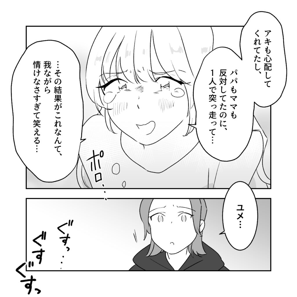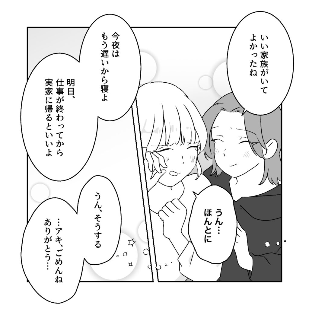 「もしユメが結婚してから、困るようなことがあったら、大丈夫だから家に帰るように伝えて・・って」と穏やかな声でアキが言いました。「・・え、ママから・・?」思ってもいなかった言葉に驚き、思わず涙が引っ込みました。そんな私に「こうなって帰りづらいのはわかるけど、ちゃんと実家に帰った方がいいよ」と背中を押してくれるアキ。