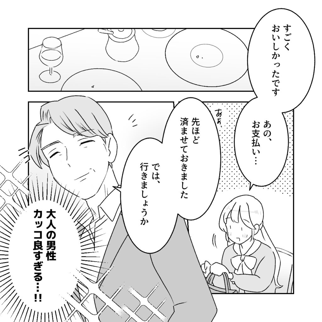 いつの間にか会計済み。食事のみで解散。スマートで紳士的な彼にメロメロ