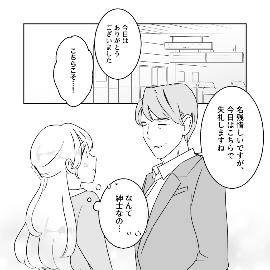 お店を出ると、和男さんは私を駅まで送ってくれ「名残惜しいですが、今日はこちらで失礼しますね」とにっこり。なんて紳士なの・・!全くガツガツしていないところに大人の余裕を感じます。