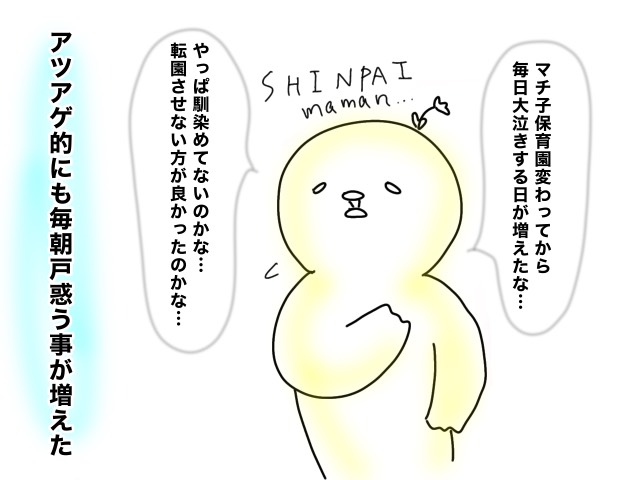 3歳のマチ子ちゃんのママであるアツアゲさんから、心が揺さぶられることのお話です。今年度から転園したマチ子ちゃんは、新しい園になってから登園を嫌がり泣くように・・・。
