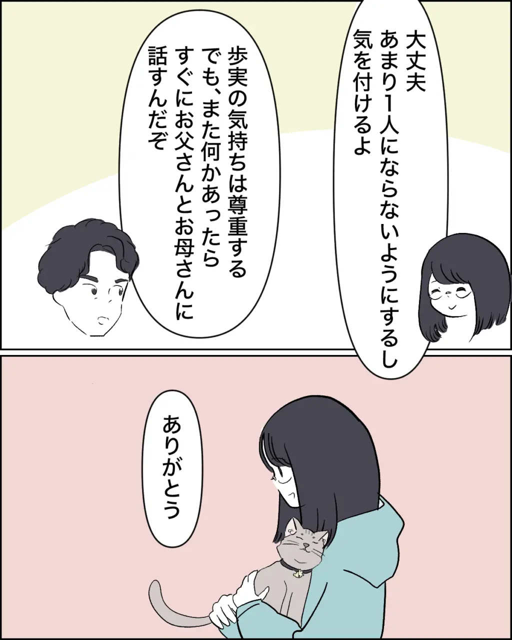 「大丈夫。あまり1人にならないようにするし、気を付けるよ」と笑顔を作る歩実に「歩実の気持ちは尊重する。でも、また何かあったらすぐにお父さんとお母さんに話すんだぞ」と博之が言うと、歩実は「ありがとう」と言いながらクッキーを抱きしめました。本当は辛くて怖いはずなのに・・私たちに心配をかけまいと気丈に振る舞う歩実に胸が締め付けられました。