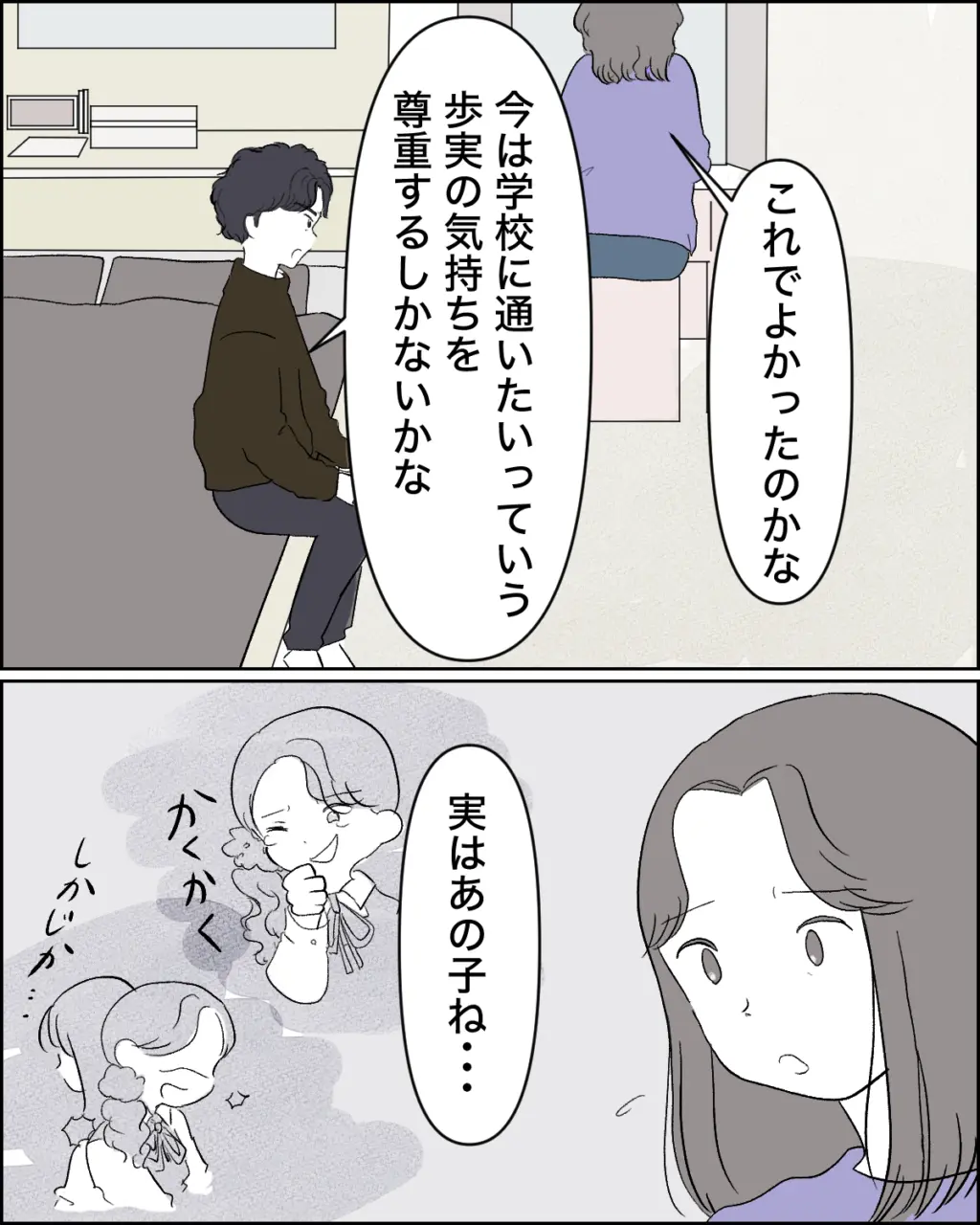歩実が寝た後、私と博之はもう一度話し合いました。「これでよかったのかな」と呟いた私に「今は学校に通いたいっていう歩実の気持ちを尊重するしかないかな」と歯がゆそうに言う博之。私は、風見さんが話し合いのときに噓泣きをしていたことや、帰り際に小声で告げ口するなと歩実に言っていたことを話しました。