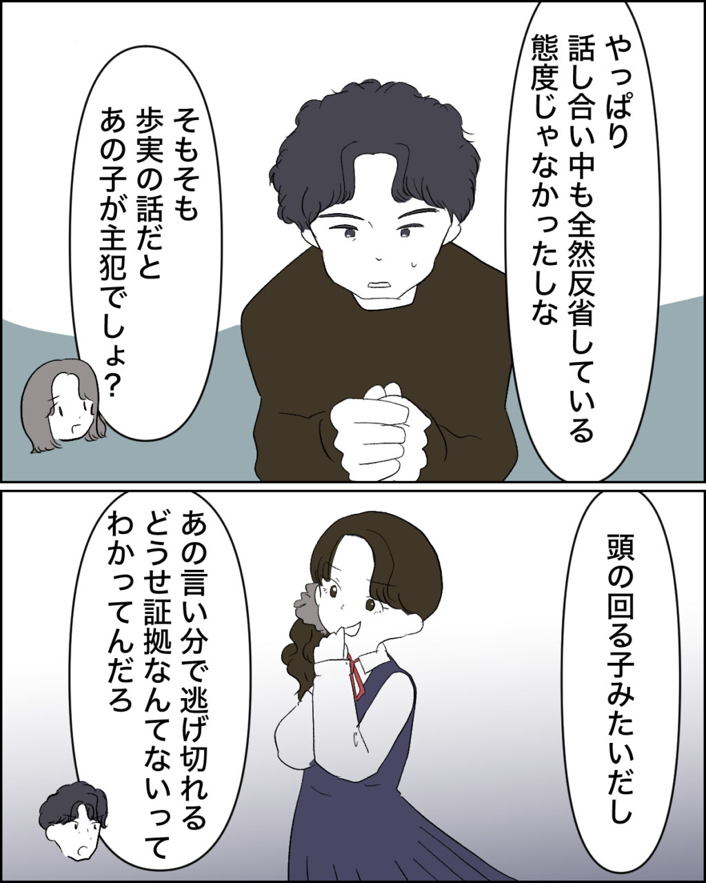 博之も風見さんの言動に違和感を覚えていたようで、「やっぱり。話し合い中も全然反省している態度じゃなかったしな」と納得の表情。「そもそも、歩実の話だとあの子が主犯でしょ?」と言うと、「頭の回る子みたいだし、あの言い分で逃げ切れる、どうせ証拠なんてないってわかってんだろ」と博之が悔しそうに言いました。