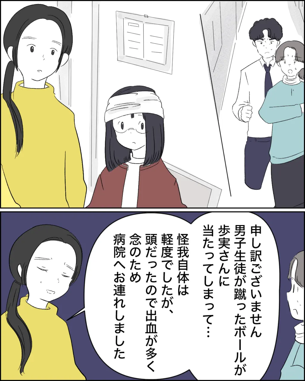 「申し訳ございません。男子生徒が蹴ったボールが歩実さんに当たってしまって・・ケガ自体は軽度でしたが、頭だったので出血が多く、念のため病院へお連れしました」先生がそう言うと、