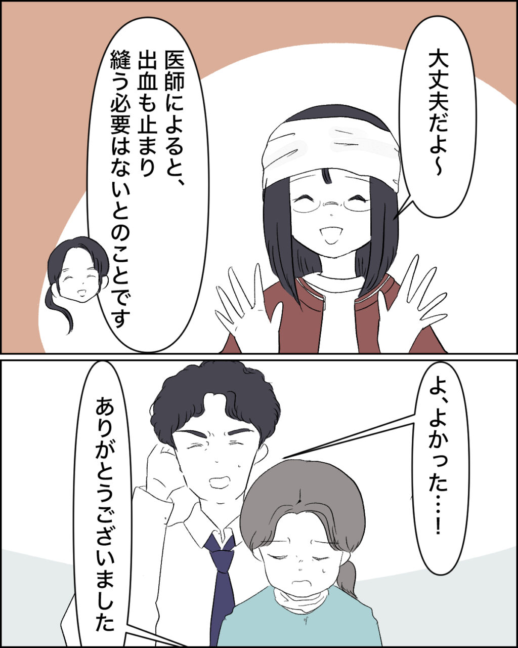 「大丈夫だよ~」歩実が笑顔でそう言うと、「医師によると、出血も止まり縫う必要はないとのことです」と先生が教えてくれ、「よ、よかった・・!」「ありがとうございました」と2人でお礼を伝えました。