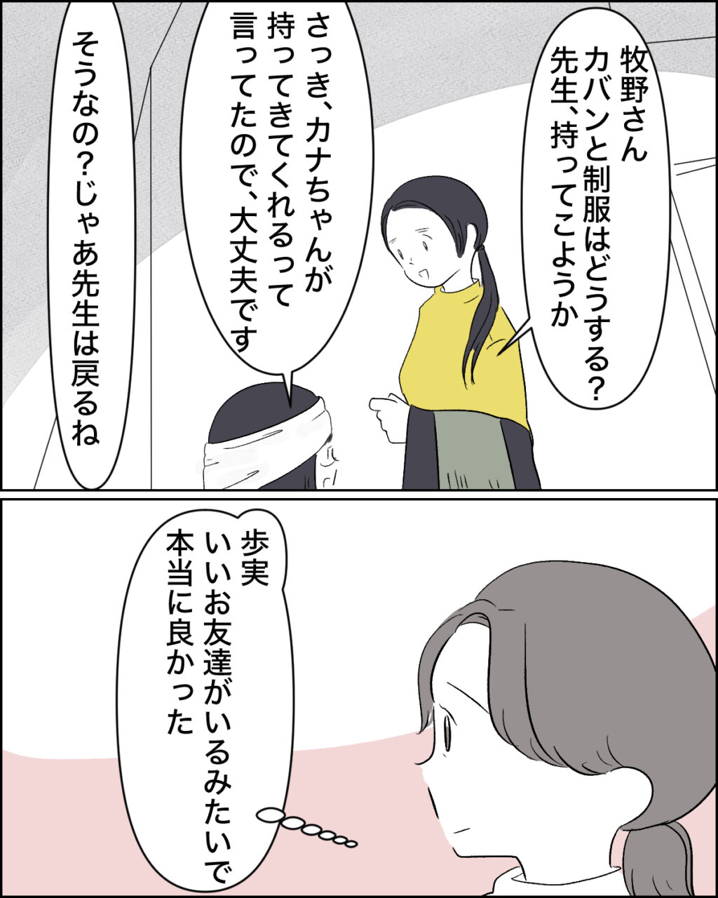 「牧野さん、カバンと制服はどうする?先生、持ってこようか」先生がそう言うと、「さっき、カナちゃんが持って来てくれるって言ってたので大丈夫です」歩実の言葉を聞いて、「そうなの?じゃあ先生は戻るね」そう言って帰り支度をする先生、歩実の先生とのやりとりを聞いて、「歩実、いいお友達がいるみたいで本当に良かった」と心の中で呟きました。