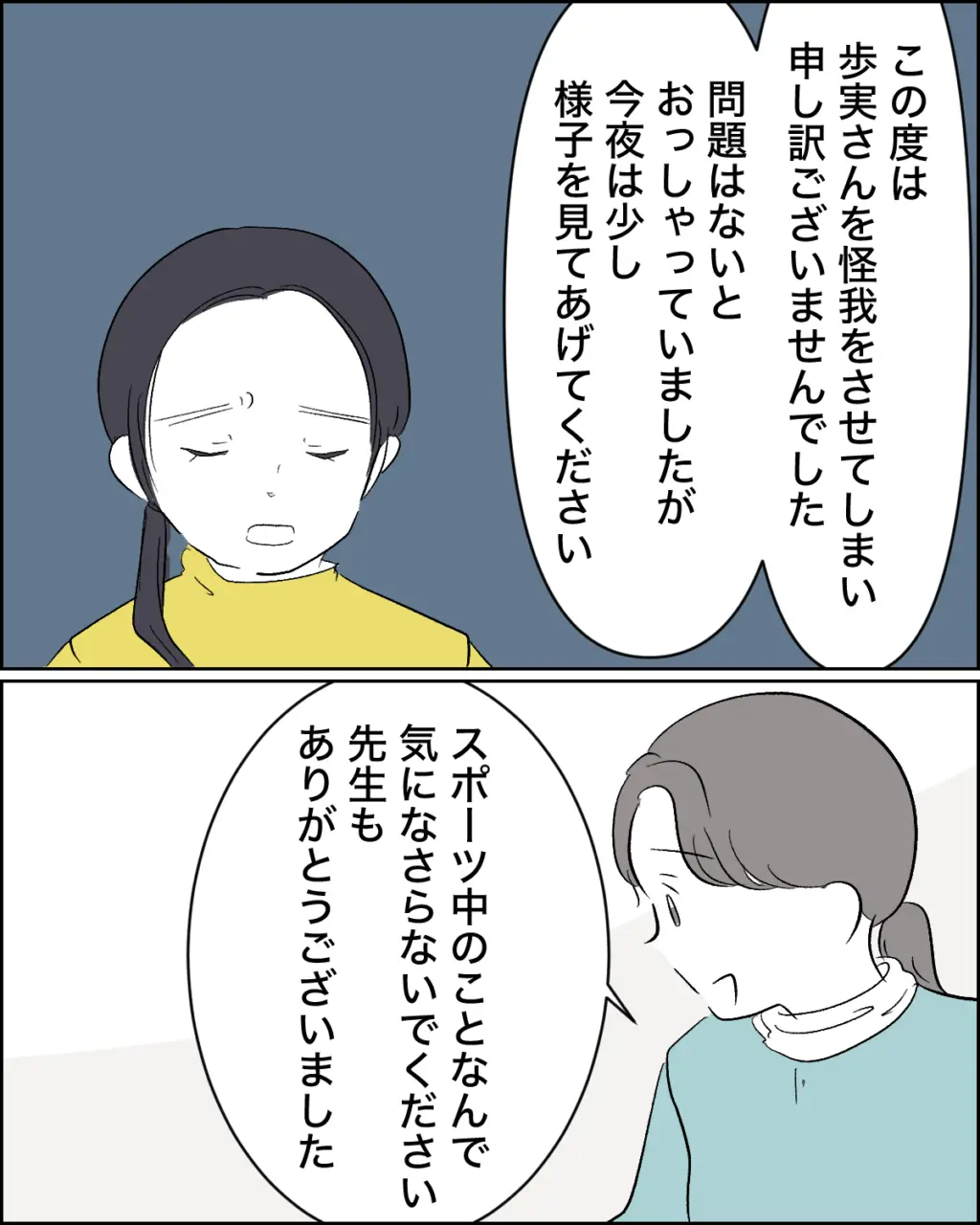 そして、「この度は、歩実さんをケガさせてしまい、申し訳ございませんでした。問題はないとおっしゃっていましたが、今夜は少し様子を見てあげてください」そう言って頭を下げる先生に、「スポーツ中のことなので、気になさらないでください。先生もありがとうございました」学校から付き添ってもらったお礼の気持ちを伝えたのでした。