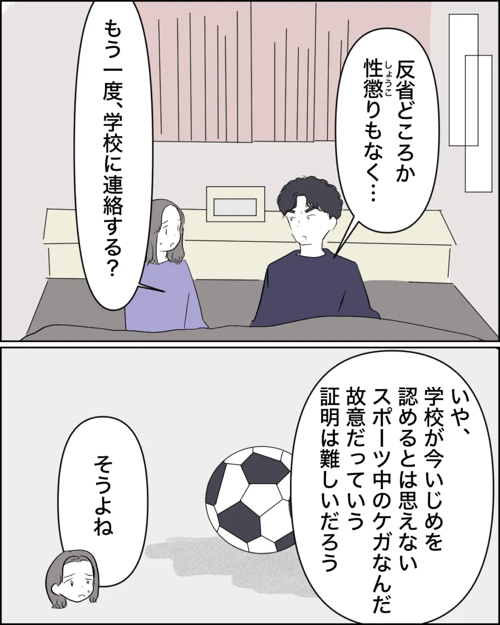夜、その話を博之にすると、「反省どころか性懲りもなく・・」と言う博之に、「もう一度、学校に連絡する?」とたずねると、「いや、学校が今いじめを認めるとは思えない。スポーツ中のケガなんだ。故意だっていう証明は難しいだろう」博之が冷静に言い、「そうよね」と私も同意しました。