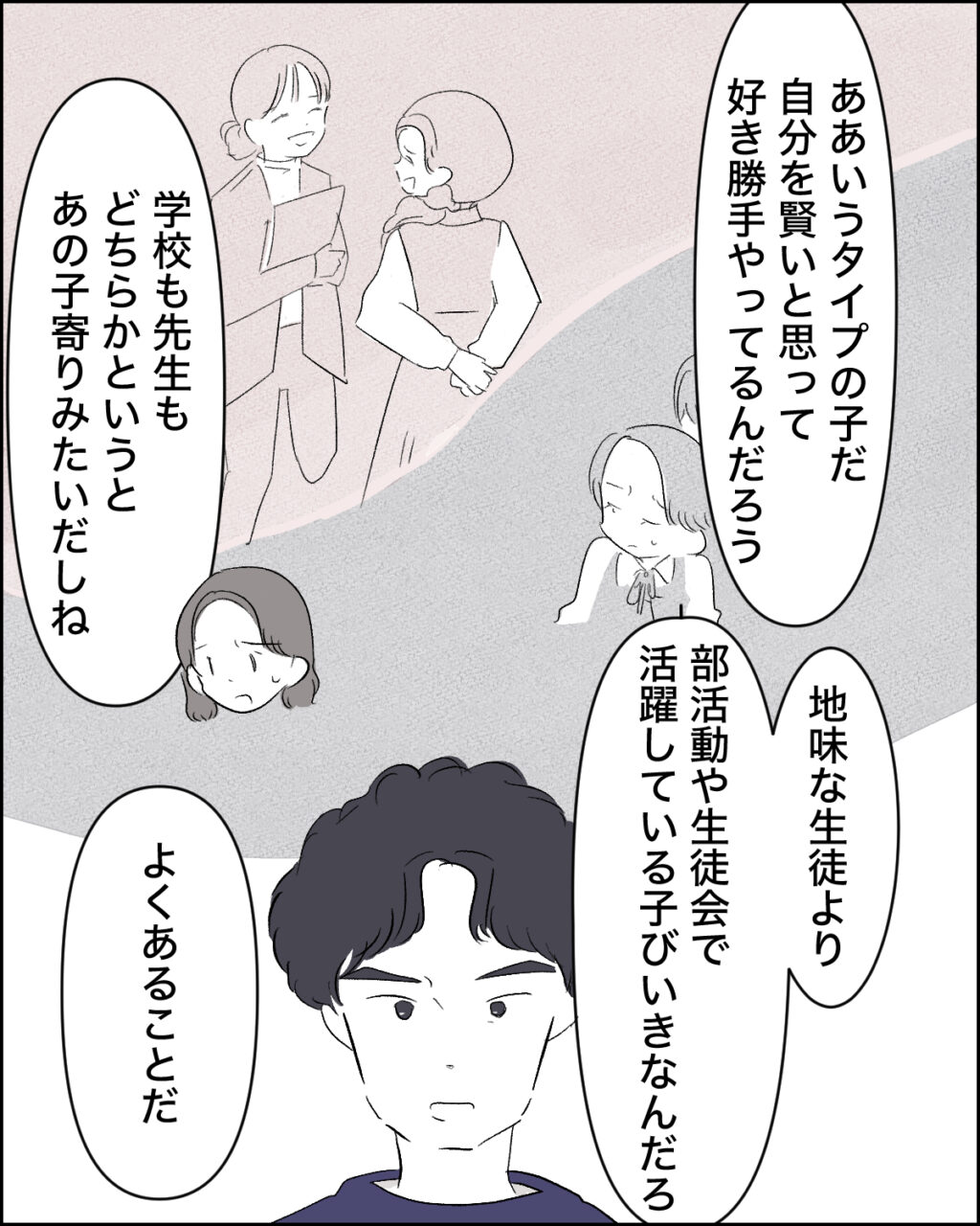 「ああいうタイプの子だ。自分を賢いと思って好き勝手やってるんだろう」そう言う博之に、「学校も先生も、どちらかというとあの子寄りみたいだしね」私がそう言うと、「地味な生徒より、部活動や生徒会で活躍している子びいきなんだろ、よくあることだ」博之が言いました。