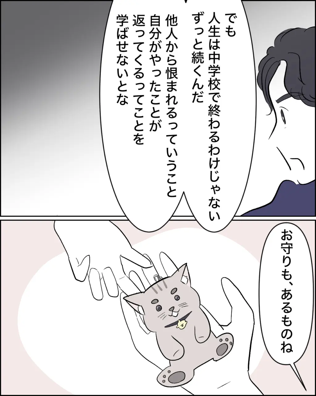 「でも、人生は中学校で終わるわけじゃない、ずっと続くんだ。他人から恨まれるっていうこと、自分がやったことが返ってくるってことを学ばせないとな」博之の言葉に続けて「お守りも、あるものね」と歩実にプレゼントしたキーホルダーを差し出す私に、