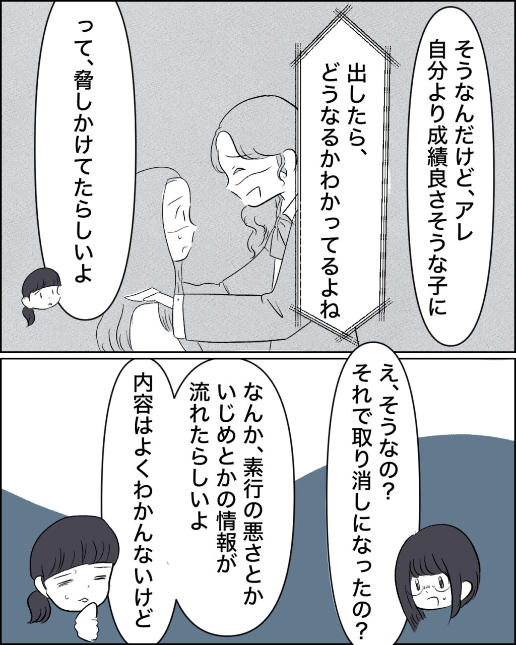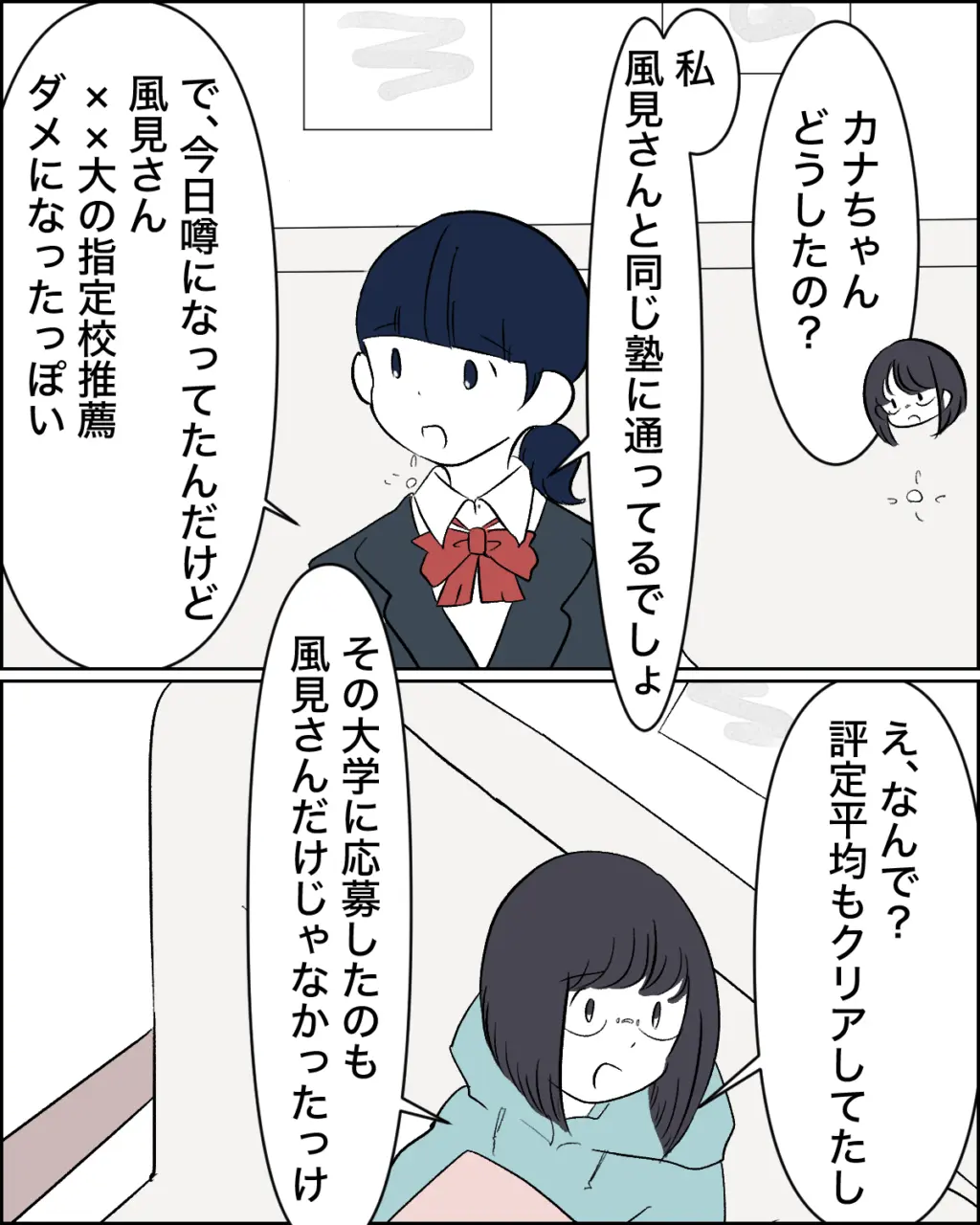 すると歩実もやってきて、「カナちゃん、どうしたの?」と聞くと、「私、風見さんと同じ塾に通ってるでしょ、で、今日噂になってたんだけど、風見さん、××大の指定校推薦ダメになったっぽい」カナちゃんの言葉に、「え、なんで?評定平均もクリアしてたし、その大学に応募したのも風見さんだけじゃなかったっけ」歩実が驚いてそう言うと、