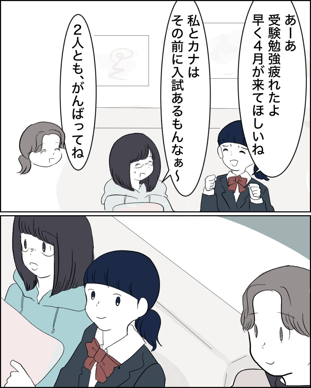 すると、「あーあ、受験勉強疲れたよ。早く4月が来てほしいね」カナちゃんにそう言われ、「私とカナはその前に入試があるもんなぁ~」と顔を見合わせる2人。「2人とも、がんばってね」私はそうエールを送り、カナちゃんとアイコンタクトを交わしたのでした。